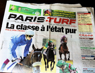 But we were there for the races! (We'll visit the Château and Stables next year) First item of business the day before is to buy a copy of Paris-Turf. The man at our local Presse, who usually sells me a copy of the International Herald Tribune and l'Officiel Spectacles, raised his eyebrows at my request. I explained we were going to the races the next day. "Est-ce que vous avez un chapeau, Madame?" he asked. I assured him I had a hat, and he promised to look for me on television.